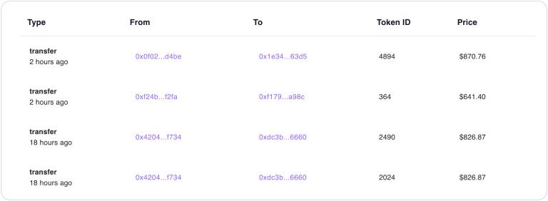 Analyze NFT transfer history, total transfers, sales, mints, burns, and unique activities.